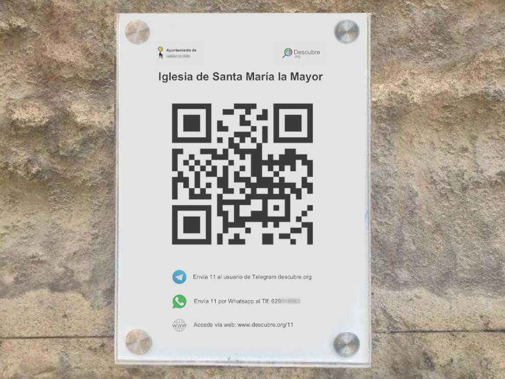 Las fichas informativas se generan automáticamente desde tu panel de control e incluyen el nombre del lugar y las diferentes vías de acceso a la información asociada al mismo: código QR, whatsapp, telegram y página web.